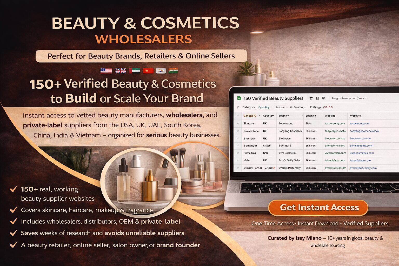 Instant access to vetted beauty and cosmetics manufacturers, wholesalers, and private-label suppliers from the USA, UK, UAE, South Korea, China, India & Vietnam — organized for serious beauty businesses.