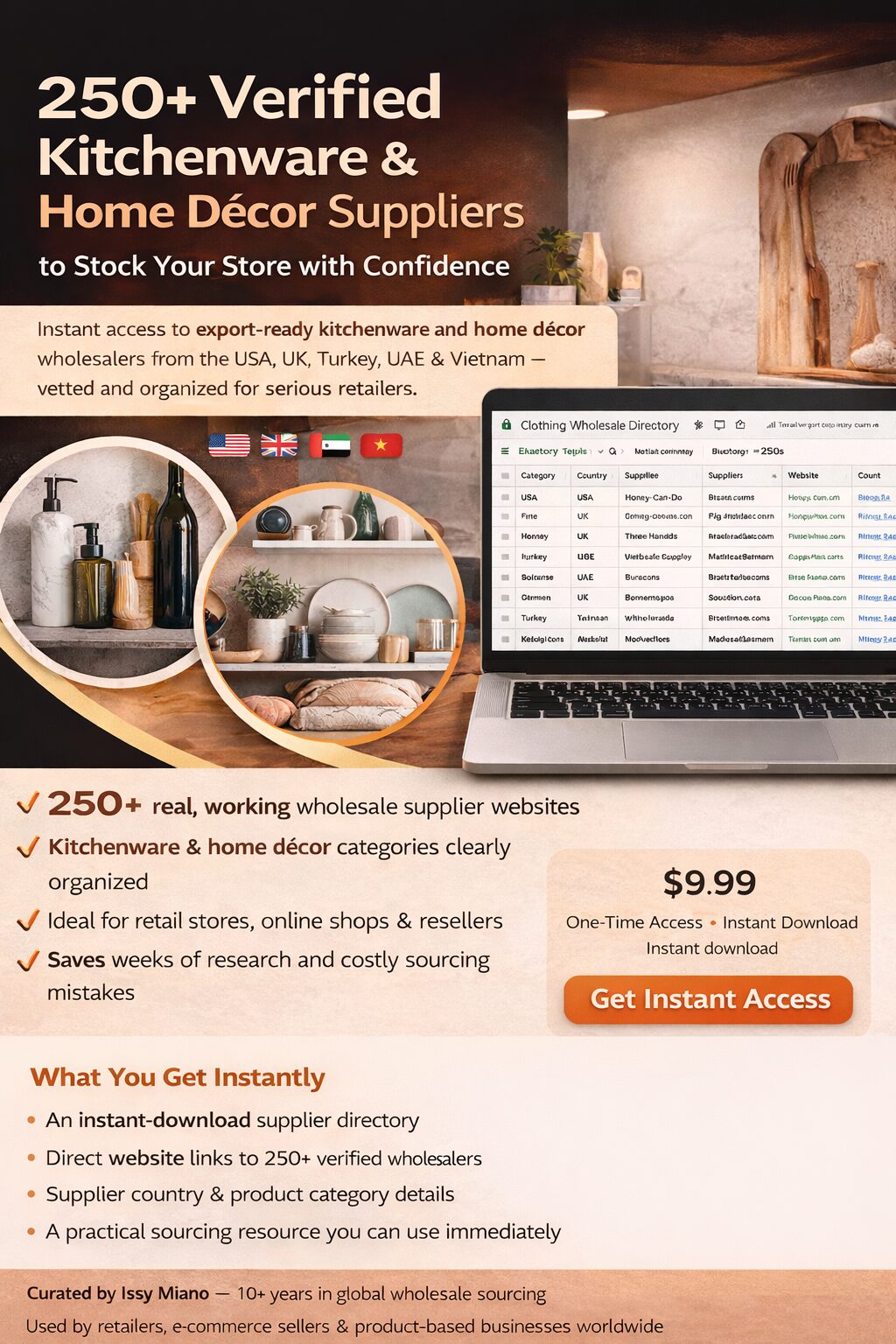 This list saved me weeks of research. I found 3 solid suppliers within an hour and already placed my first order. Highly recommend for anyone starting a homeware store.